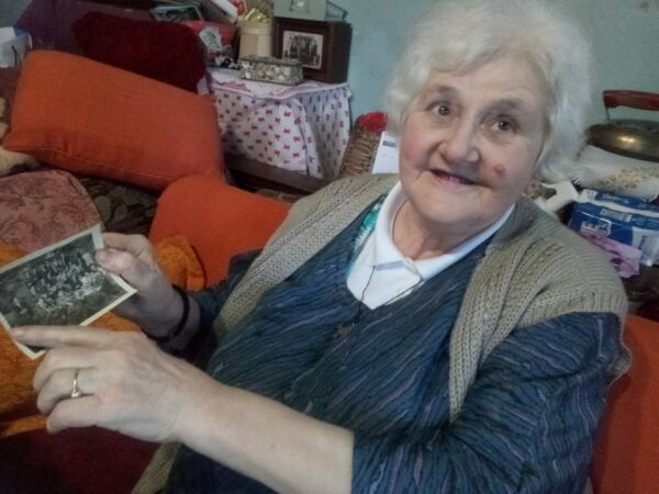 „Ово је Мила Тошевић, њен муж је био златар, њихов је био Бараковац, продали су га и сада је ту направљено гробље. Ово је Борка Мормељ, њена кућа је била испод општине, поред старе зграде поште и куће у којој је био Централни комитет, то је све срушено и направљене стамбене зграде, гдје је сада Емтел. Ово је Мила Соколовић, она и њен муж Божо имали су кућу пуну дјеце, имали су чудотворну икону Мајке Божије, па је свијет одлазио код њих да однесе уља, прислужи кандило, примали су људе. Ово је Ћебовић, а њихова кућа је она старинска на пијаци, у њој данас нико не живи, а сјећам се када су били протести за Трст на њиховом балкону су функционери држали говоре народу... “, набраја Мира показујући на слику.