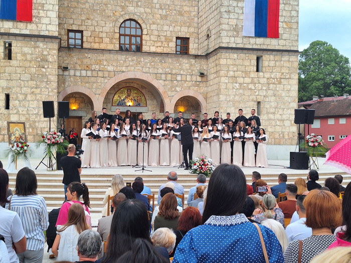 У једноипочасовном програму на платоу Храма Светог Саве у Фочи, чији је дио због кише изведен и под сводовима храма, публика је уживала у композицијама духовне и народне музике.