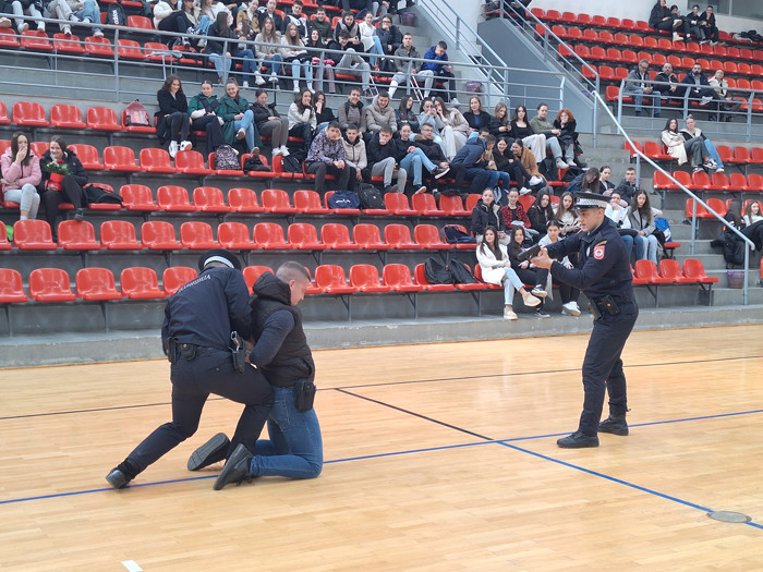 Средњошколцима у Фочи предстваљена је опрема коју полицијске јединице свакодневно користе у свом раду. Пажњу им је привукла и показна вјежба легитимисања и лишавања слободе сумњиве особе коју су извели полицијски службеници Полицијске управе Фоча.