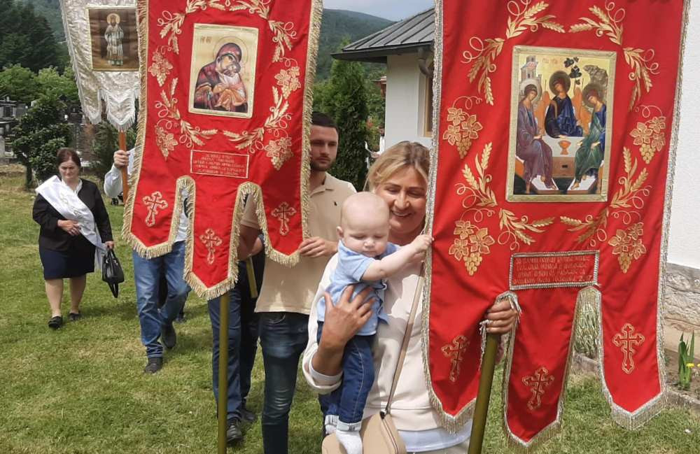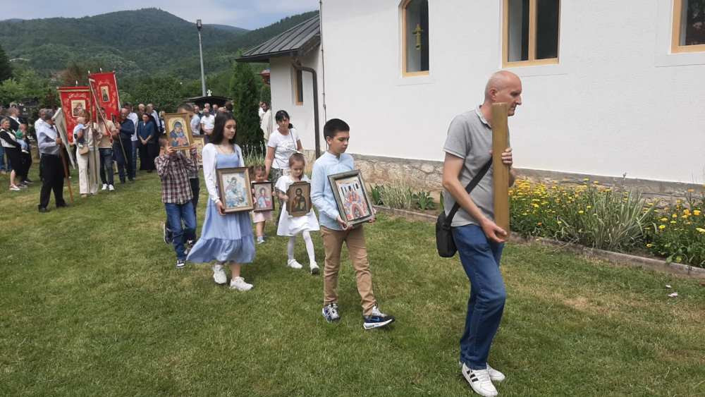 "Да славимо Тројчиндане, мушке, а и женске главе да се множе, а честитим нашим парохијанима Устиколине, Јабуке и осталих наших села драги Бог да поможе!", нагласио је Гаговић.