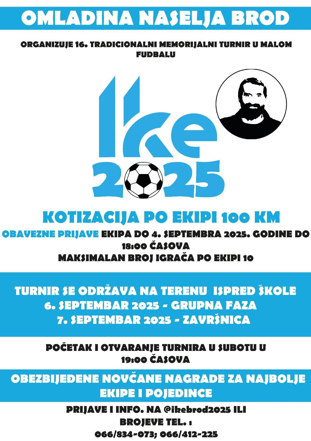 Меморијални турнир у малом фудбалу „Ике Брод 2025“ одржаће се у суботу и недјељу, 6. и 7. септембра, на школском терену у Броду на Дрини.
