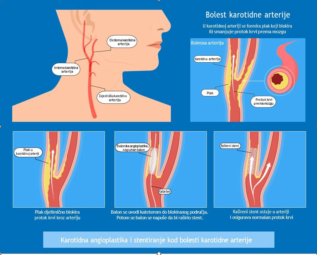 Каротидна болест, једна од најчешћих васкуларних, представља запушење каротида у предјелу врата које исхрањују мозак. Запушење је посљедица артеросклерозе, односно стварања плака на крвним судовима, којa може комплетно да запуши каротидну артерију и доведе до настанка можданог удара, појашњава васкуларни хирург Универзитетске болнице у Фочи, Срђан Радановић. „Ми се више плашимо нестабилног каротидног плака који може да се одломи и да, ношен крвном струјом, оде у мождану циркулацију, запуши неку од можданих артерија и направи шлог, односно мождани удар. То је болест која се може спријечити, промјеном животних навика али и редовним прегледима код љекара, гдје се једноставним ултразвучним прегледом може открити болест док је још асимптоматска и није за операцију. Суштина је да откријемо стенозе, односно сужења каротидних артерија која нису значајна. Тада ми кажемо пацијентима да промијени животне навике, престану пушити, повећају физичку активност, регулишу крвни притисак, и то је све оно што може да спријечи прогресију артеросклерозе“, рекао је Радановић гостујући у Јутарњем програму Радио Фоче.