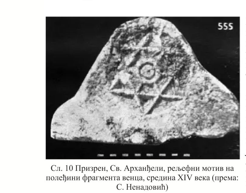 Осим подних звијезда у припрати /14. вијек/ и спољашњој припрати /16. вијек/ манастира Лесново, она доноси и примјер шестокраке звијезде у поду Цркве Светих Арханђела код Призрена, познате задужбине цара Душана, те више примјера коришћења овог симбола на дверима, оквирима икона и разном црквеном намјештају у Дечанима, Слепчу и Трескавцу у Македонији, Благовештењу под Кабларом…