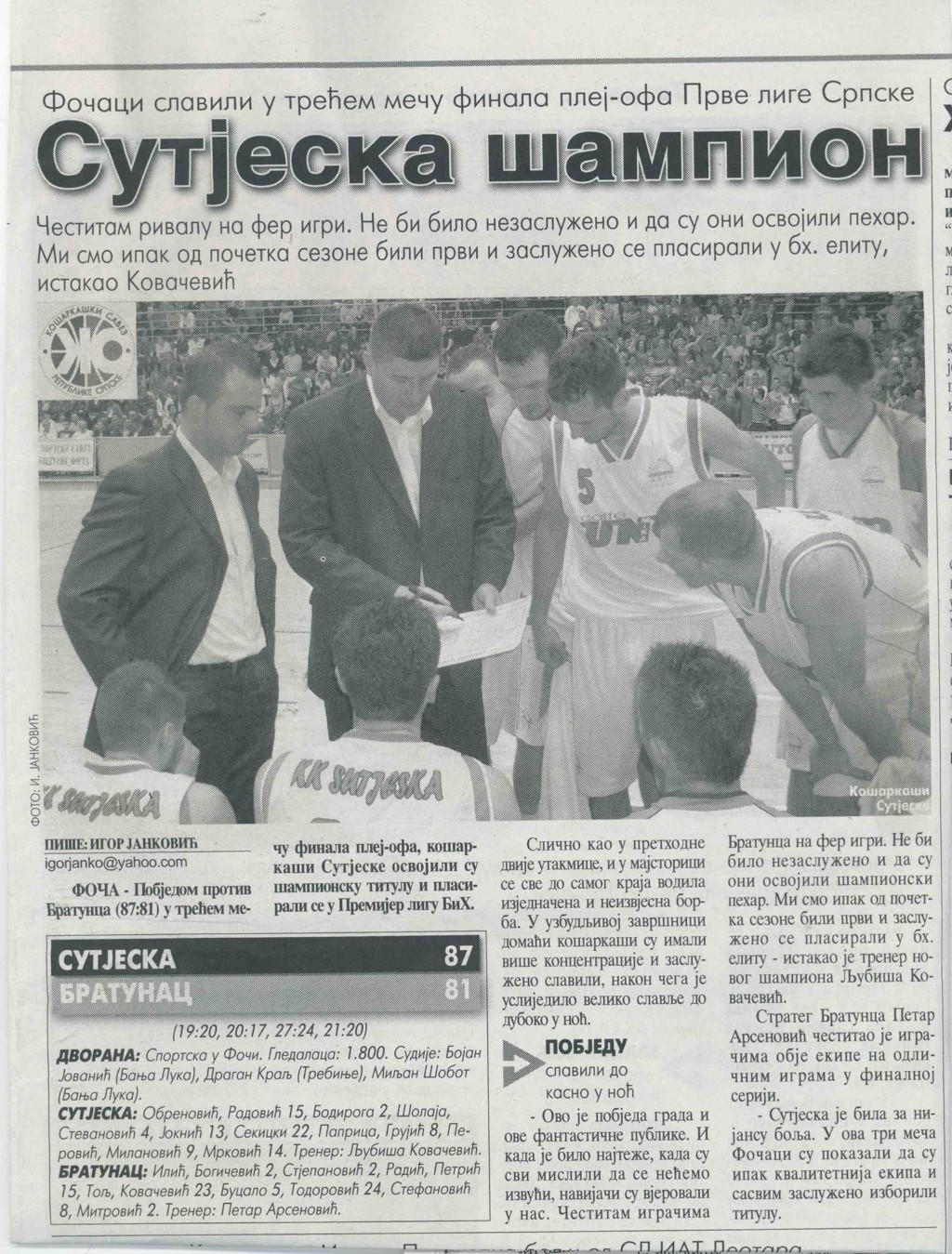 „Када је 1993. године почео да се поново успоставља живот у Фочи, па и спортски, није могло без Љубе кошаркаша. Тада су кренули да играју кошарку, свраћали по Љубишу у Хан Пијесак у касарну, да би ишао на утакмицу. Опет су га враћали у касарну, а он из касарне на положај. Тако до краја рата. До чувених утакмица у Власеници, Зворнику, Бијељини. Играла се и Друга лига, па је услиједио пласман у Прву лигу, домаће утакмице у Рогатици и Вишеграду, опстанак у Лиги. У међувремену се изградила дворана, дошла је сезона 2008/2009 и чудо над чудима, највећи послијератни успјех фочанског спорта када смо постали шампиони Републике Српске“, присјетио се некадашњи Ковачевићев помоћник на клупи „Сутјеске“.
